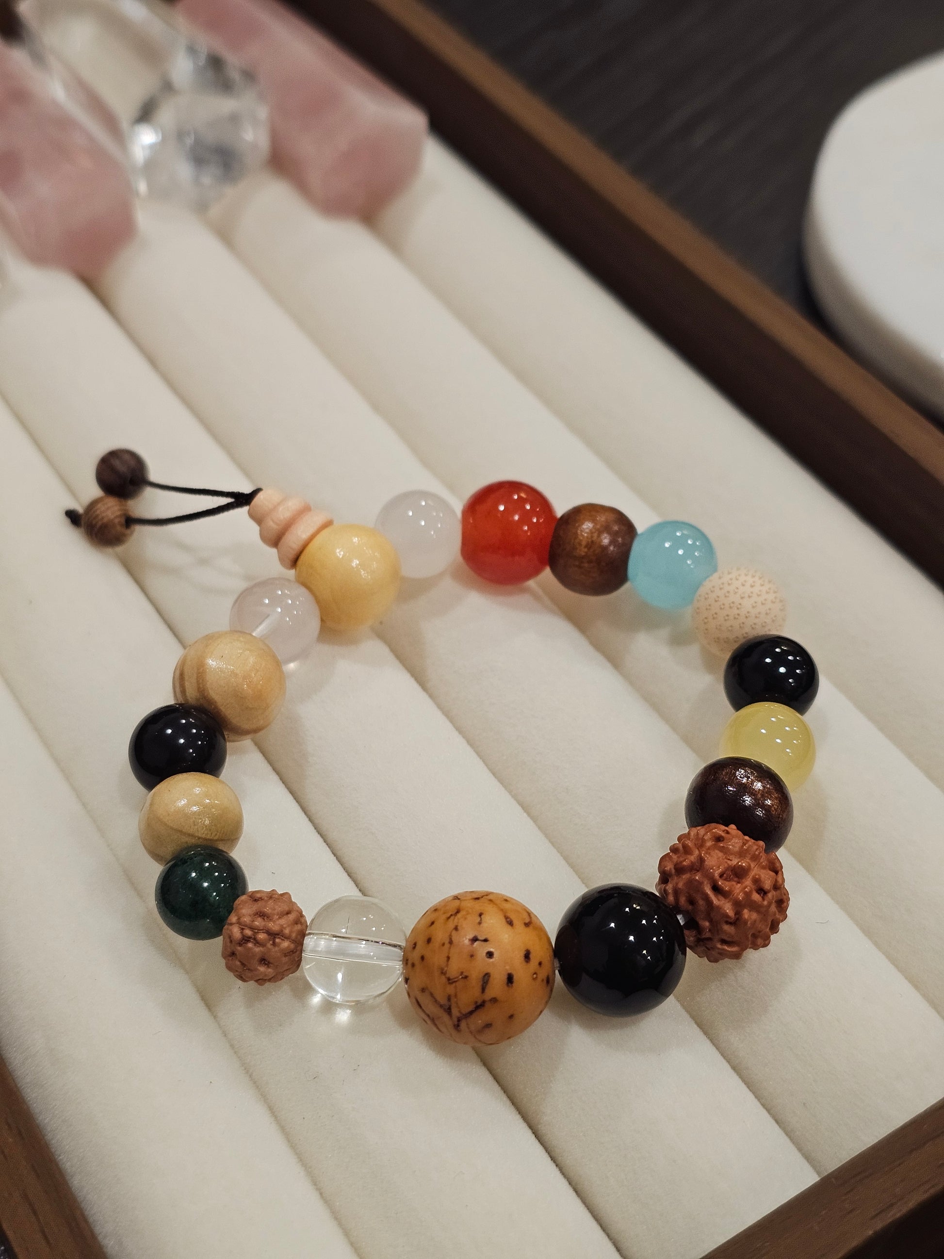 this bracelet combines Clear Quartz, Golden Bamboo, Green Strawberry Quartz, Rudraksha, Obsidian, Smoky Quartz, Yellow Jade, South Red Agate, and Aquamarine.