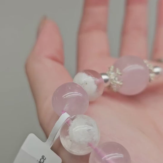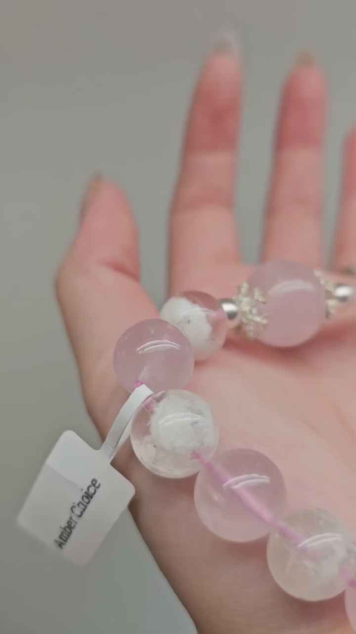 This crystal features soft pink tones with delicate white snow-like inclusions,