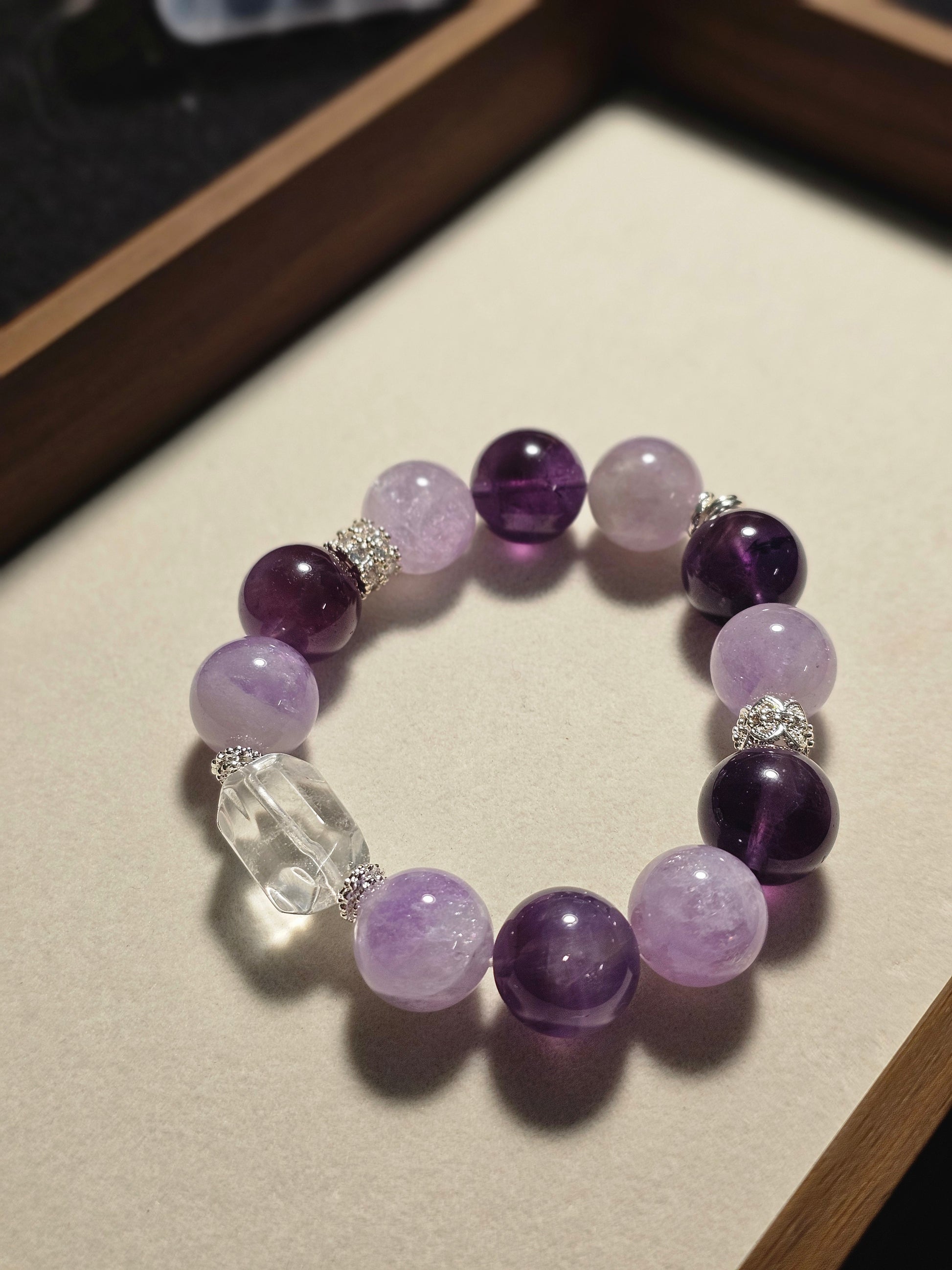“Purple Aura Rising” Energy Bracelet 14mm Amethyst × Lepidolite × Clear Quartz Cube