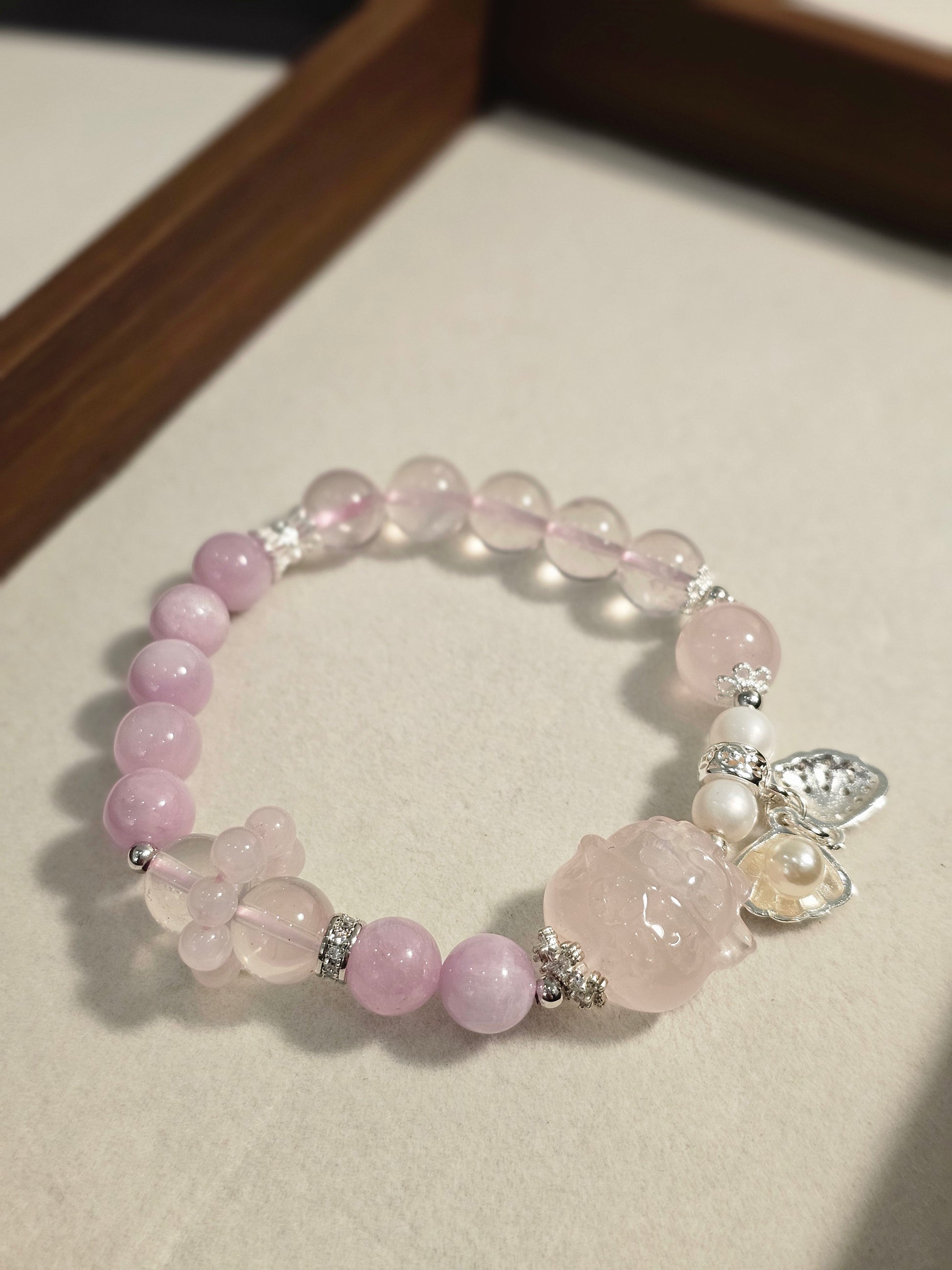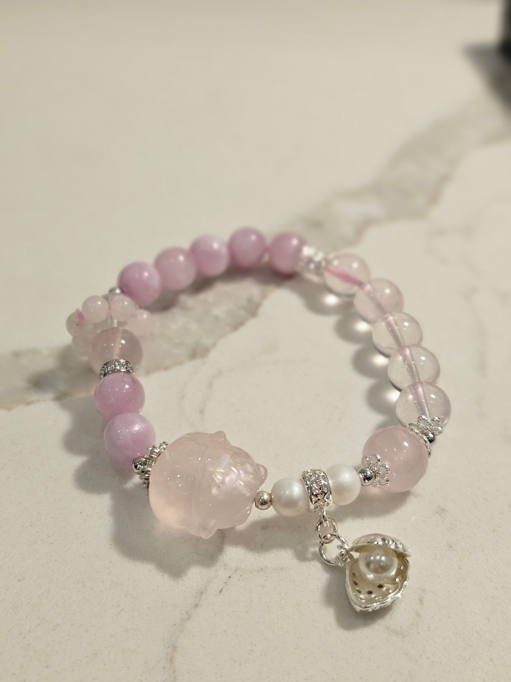 Rose Quartz Lucky Cat × Kunzite × Freshwater Pearl Bracelet